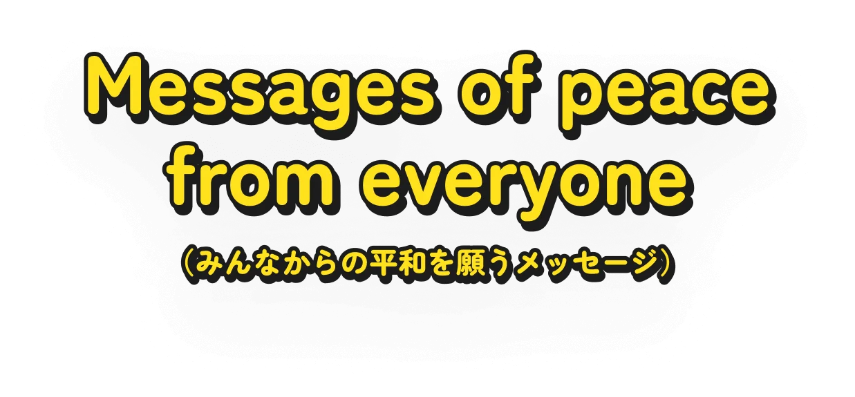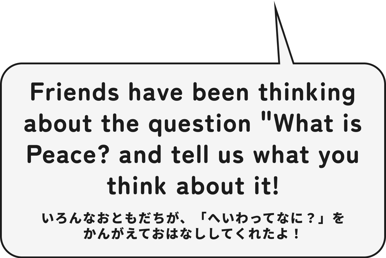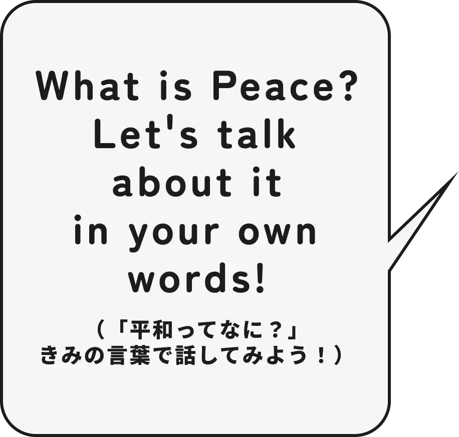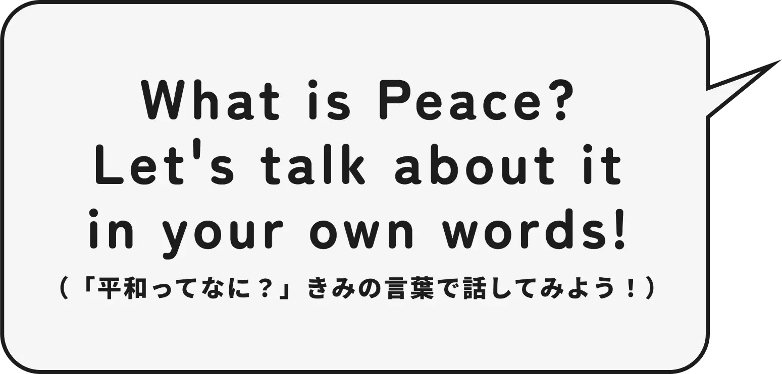 No need for complicated answers. When asked, "What is peace?" just share what comes to mind in your own words. (難しいことはいりません。「平和ってなに?」と聞かれて思ったことを、そのまま自分の言葉で伝えてください。)